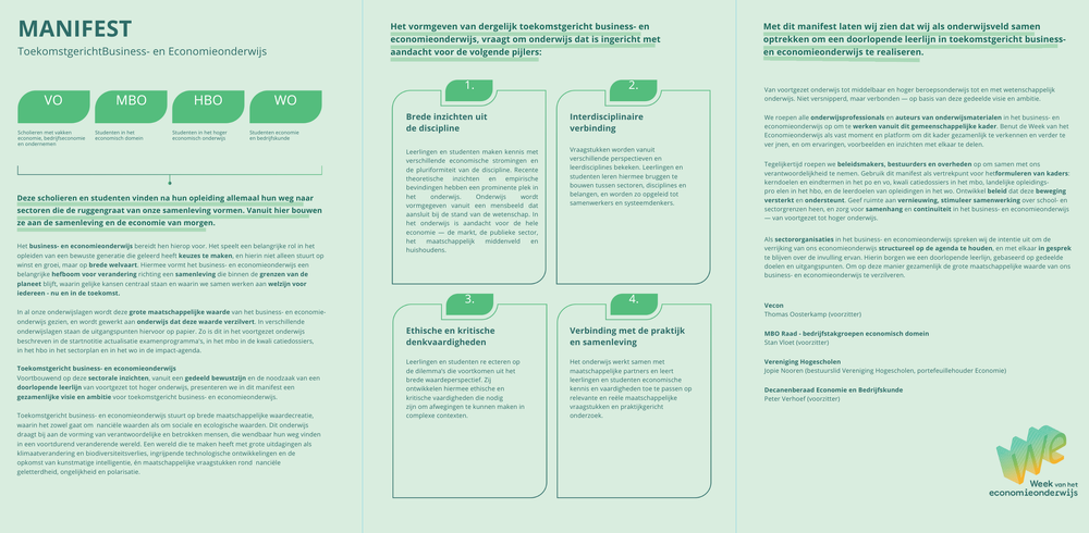 Deze middag markeerde ook de start van de vierde Week van het Economieonderwijs en de ondertekening van het manifest ‘Toekomstgericht Business- en Economieonderwijs’ door Thomas Oosterkamp, Stan Vloet, Jopie Nooren en Peter Verhoef namens de onderwijslagen vo, mbo, hbo en wo. Hiermee gaven zij het startsein voor de Week van het Economieonderwijs, waarin het manifest verder vorm kreeg.